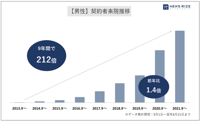 当院の【医療脱毛を契約した男性患者数(推移)】の場合、9年前の「2013年9月1日~2014年8月31日」から「2021年9月1日~2022年8月31日」で比較すると、「212倍(前年比:1.4倍)」に増加しています。