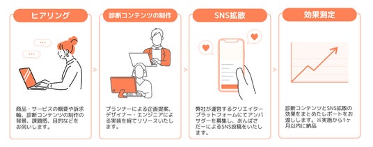 本プランは、企業のファン育成の打ち手の1つとして診断コンテンツの企画制作を得意とする「株式会社ファン・マーケティング」とSNSマーケティング支援に強みを持つ弊社「株式会社CREAVE」が共同で制作したオリジナルプランとなります。課題や目的に合わせた最適な診断コンテンツの企画制作を行い、SNSでの拡散を通した診断コンテンツの効果最大化までご支援いたします。