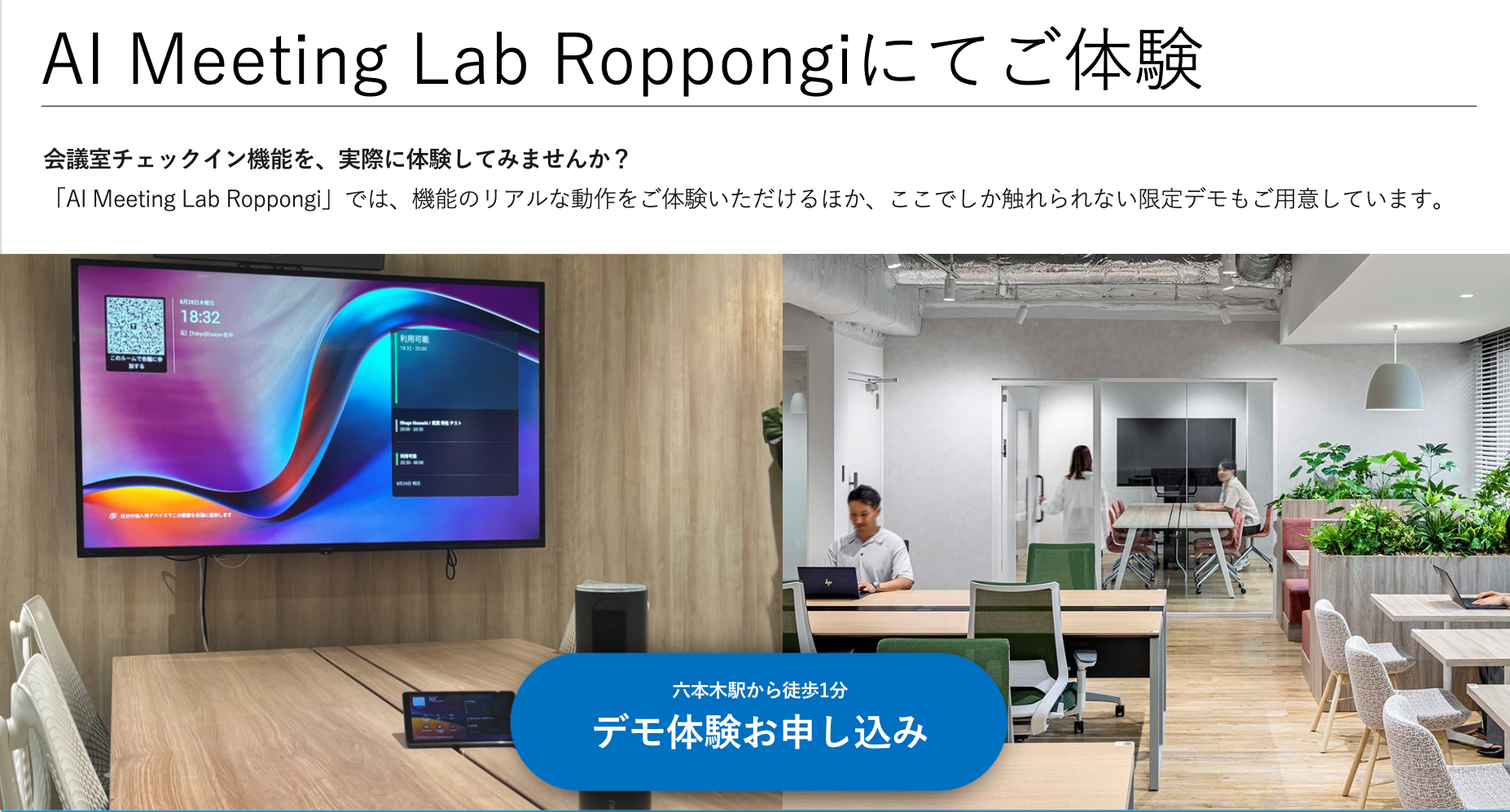 Acall が大切にしているのは、機能や仕組みとして理解することではなく、「会議の現場で何がどう変わるのか」を体感していただくことです。Acall 六本木オフィスでは、実際の会議室チェックインの流れや、来訪者・従業員の動線、会議デバイスや各種プロダクト連携を、実際のオフィス環境の中で体験いただけるデモ・見学を実施しています。