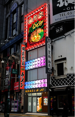 ネオン管が配置され入り口には高さ2mのLEDデジタルサイネージを