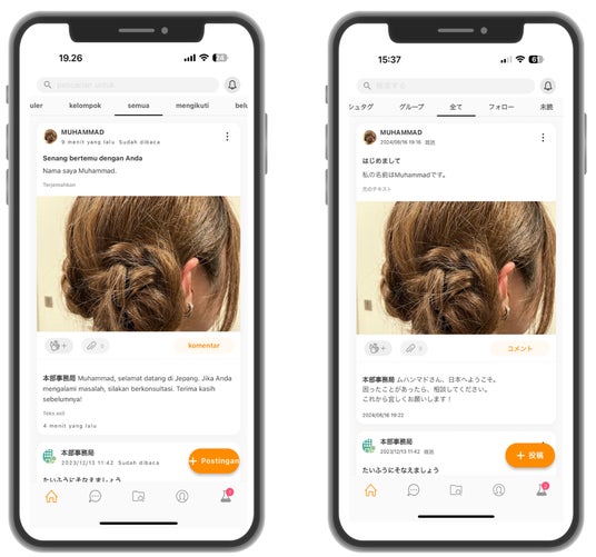 「soeasy buddy for 特定技能」の専用SNSとトーク機能に投稿された言語をボタン一つで最新AIが自動翻訳。ベトナム語、インドネシア語をはじめ50か国語以上に対応し、通訳者がすぐ対応できない時でも、スムーズなコミュニケーションを実現できます。外国人財が安心して働ける環境や相談できる関係構築をサポートします。