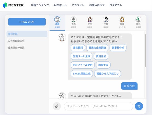 特定の業務(営業・経理・法務・技術・マーケなど)を担当するAI社員です。汎用的なAIツールと異なり、業務フローをテンプレート化した「仕事メニュー」から依頼するだけで業務の支援実現が可能です。