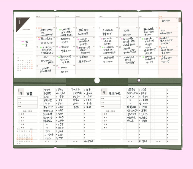 月間カレンダーと家計簿部分を切り分け、手帳カバー内に月間カレンダー手帳と家計簿帳がセットされています。これにより月の予定と支出記録・管理をページ間の移動なく同時に確認する事が可能です。