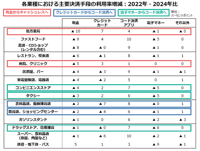 図7: 各業種における主要決済手段の利用率増減:2022年・2024年比
