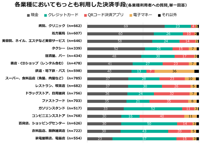 各業種における決済手段について尋ねる質問では、キャッシュレス決済比率が高い業種は1位家電量販店、2位衣料品店、3位百貨店でした。現金比率が高い業種は、1位病院、2位処方薬局、3位美容サービスです。
