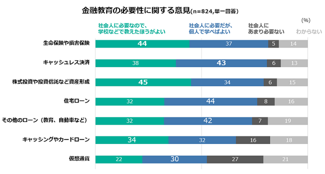 「社会人にとって必要な金融サービスの知識」を尋ねる質問では、1位保険、2位キャッシュレス決済、3位資産形成の順に必要であるという回答になりました。内訳は、保険、資産形成は「学校などで教えたほうがよい」の割合が多いのに対し、キャッシュレス決済は「個人で学べばよい」の割合が多い結果になりました。