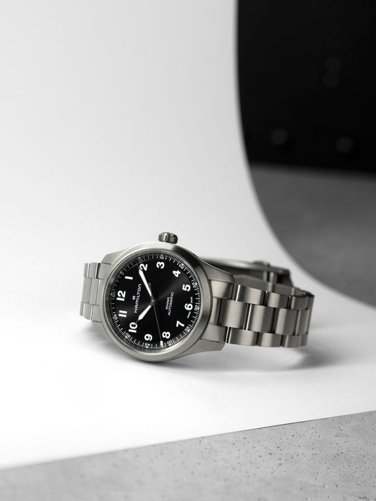 チタニウム製のブレスレットと組み合わせたこの時計は、「カーキ フィールド」の冒険的なポテンシャルと耐久性、堅牢性を両立させています。文字盤は、フィールドウォッチたるべきものとして、鈴木氏は余計な要素を減らすことを選択しました。