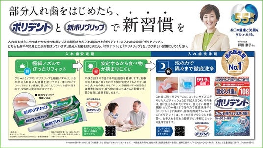 Haleonジャパン株式会社(代表取締役社長:野上 麻理、本社:東京都港区)は、入れ歯洗浄剤の歯科医推奨No.1 *1ブランド「ポリデント」と、入れ歯安定剤のロングセラーブランド「ポリグリップ」が、日本で発売を開始して55周年を迎えたことをお知らせします。義歯ケア製品カテゴリーにおけるリーディングブランドとして、「ポリデント」「ポリグリップ」は、これからもみなさまの健やかな笑顔を支え続けます。