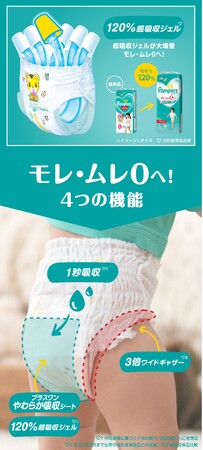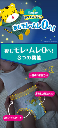 おねしょ防止パッドを採用し、一晩中のおしっこを受け止めます。パンパース史上最高の吸収力*4で、最長12時間モレを防止。