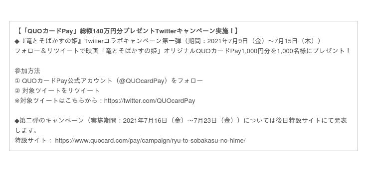 ■映画『竜とそばかすの姫』の公開を記念してTwitterキャンペーンにて総額140万円分のQUOカードPayをプレゼント