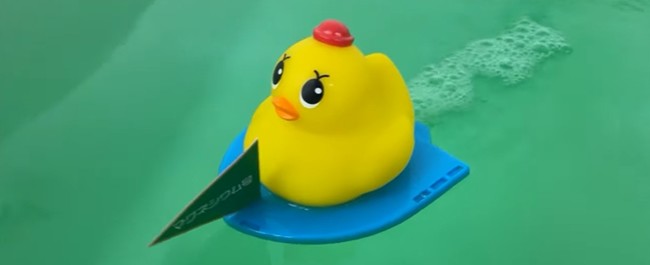 ・「きき湯」を「アヒル隊長」専用ボートにセットしてお風呂に浮かべると、「きき湯」の発泡の力で「アヒル隊長」がすいすいと湯面を進みながら、炭酸ガスがお湯に溶け込みます。