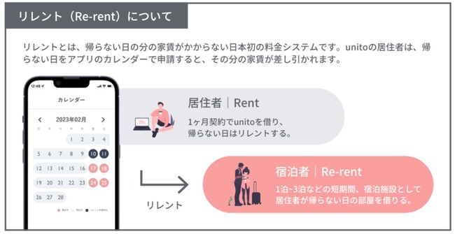 最大の特徴は、ユニットならではの「リレント」を採用した料金システムで、1ヶ月単位で契約し帰らない日は部屋を貸し出すことで家賃を減額する居住者として、ホテルとして1日単位で予約をする宿泊者としての2パターンの契約形態でご利用いただけます。