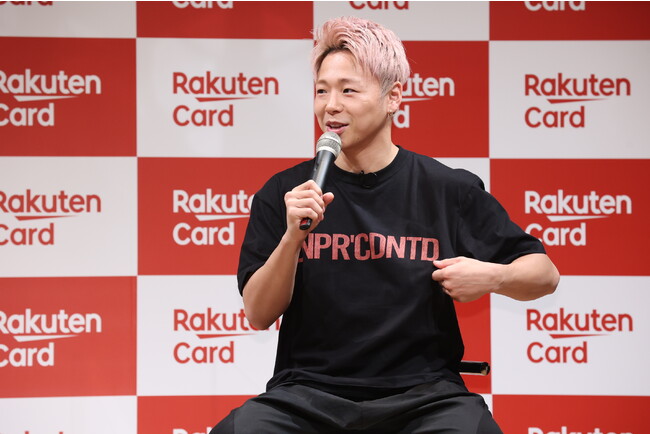 自身が楽天カードのデザインになることについて尋ねると、「若い頃から使っている楽天カードのデザインになれることがすごく嬉しいです。また、これをきっかけに格闘技もさらに盛り上げていけるよう頑張りたいと思います」と笑顔でコメントしました。また、「僕のラッキーカラーのゴールドと赤が入っていて、すごくかっこいいデザインだと思います。運気が上がりそうですね」と話し、出来栄えに思わず笑顔を見せました。