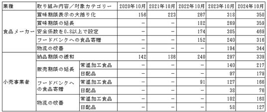 食品寄贈に関しても、食品メーカーでは76社増の316社、小売事業者では77社増の242社がフードバンクへの食品寄贈を実施。その他、販売期限の延長や物流改善に取り組む事業者も多く、食品ロス削減に向けた具体的な取り組みが各事業者のウェブサイトで公開されています。