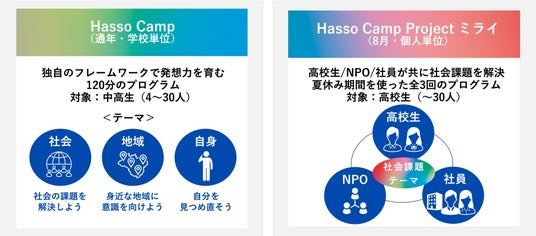 Hasso Campには、1.年間を通して応募でき学校単位で実施する「Hasso Camp」と、2.長期の休暇期間中に高校生が個人で参加できる「Hasso Camp Project ミライ」の2つのプログラムがあります。