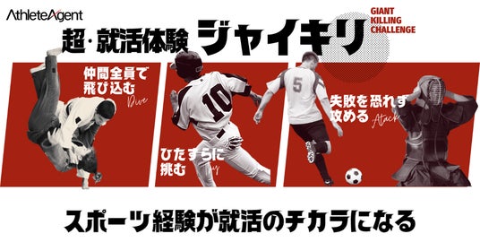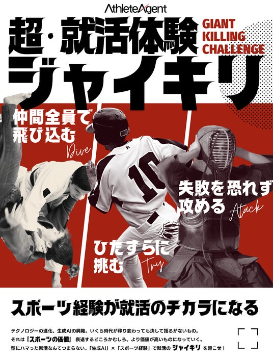 【ジャイキリ(GIANT KILLING CHALLENGE)に込められた意味】 テクノロジーの進化や生成AIの台頭により、時代は急速に変化しています。しかし、こうした変革の中でも決して揺るがない価値、それが”スポーツ”です。「型にハマった就活」から一歩抜け出し、「生成AI」と「スポーツ経験」を組み合わせることで、今までにない就職活動のスタイルを実現し、採用において、自分らしい“ジャイアントキリング”を起こしてもらえるように願いを込めて、イベント名にしました。