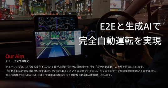 チューリングは、カメラから取得したデータのみでステアリング、ブレーキ、アクセルなど、運転に必要なすべての判断をAIが行うE2E(End-to-End)の自動運転開発を進めています。特に自動運転に特化した独自開発のマルチモーダル生成AI「Heron」の開発を行い、経済産業省によるGENIAC(競争力のある生成AI基盤モデル開発事業者)に選定されています。