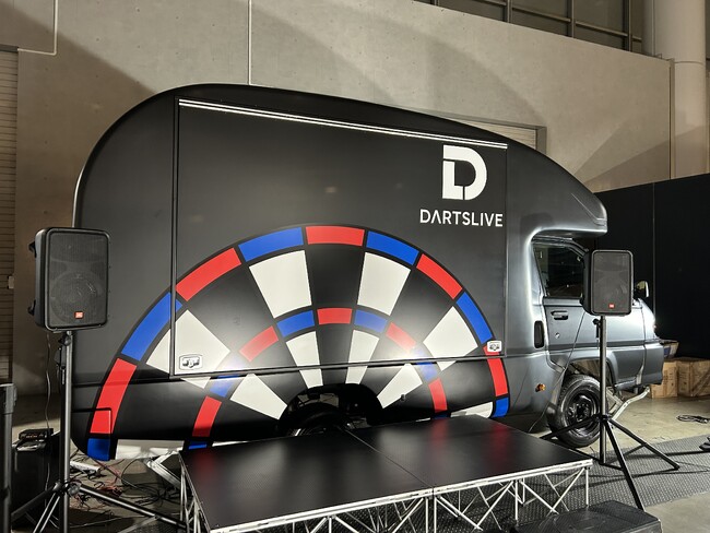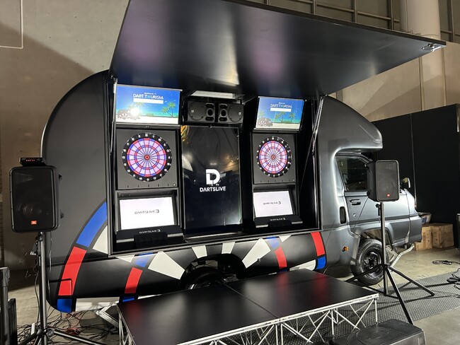 この日、発表となったのはダーツマシン(ダーツライブ3)を2台搭載した、その名も「ダーツライブカー」。ダーツライブカーは、ダーツ×旅をテーマにさまざまな企画を展開する『ダーツツーリズム』内の「1万人ダーツチャレンジ」のためにキャンピングカーを改装し製造された、世界で一台だけのオリジナルワゴン車です。2023年9月9日(土)を皮切りに北は北海道、南は宮崎県まで全国日本を横断しながら、ダーツ体験人数1万人を目指して日本各地を駆け巡ります。