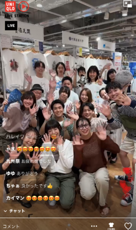 ユニクロ様の注目商品を紹介する生配信「LIVE STATION」では、今回制作したTシャツデザインが選ばれた大阪芸術大学デザイン学科3年生の5名とデザイン学科教授が生出演いたしました。