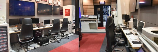 報道スタジオに隣接する1階フロアでは、THE TABLE / ラバーウッド ナチュラル × Black Steelを設置。白や赤を基調としたスタイリッシュな空間の中に、木のぬくもりが溶け込み、柔らかなコントラストを添えています。ベージュのデスクチェアやリノリウム天板を使用した電動昇降デスクなども採用され、スマートで洗練された報道フロアを演出しました。