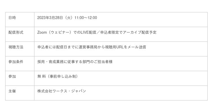 株式会社ワークス・ジャパン(本社:東京都千代田区、代表取締役:清水信一郎、以下 ワークス・ジャパン)は、2023年3月28日(火)に採用・育成業務に従事する部門のご担当者を対象にしたオンラインセミナー、『キャリア形成を支援する今話題沸騰中の社内公募制度・キャリアチャレンジ制度とは?』を開催します。参加無料、事前申込制、ZOOMで配信します。