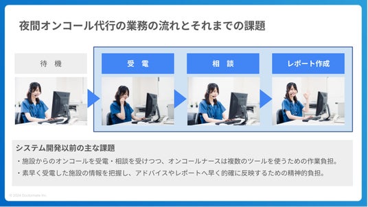 当社のメインサービスである夜間オンコール代行(TM)は、日本全国の看護師をオンラインでつなげて提供してます。これまでに創業から8万件以上のご利用いただいておりますが、件数が増加するのと比例して、看護師の人数と業務負担も増加してきました。夜間オンコール代行(TM)では「待機・受電・相談・レポート」の一連の作業を別々のツールで行う必要があり、効率の悪さと、手間の多さが誤操作などを生むリスクと負担がありました。