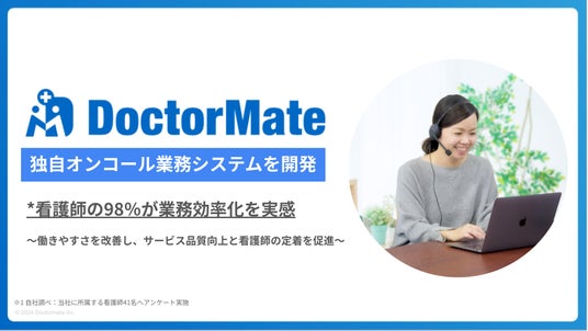 介護事業所向けに医療ソリューションを提供するドクターメイト株式会社(代表取締役・医師 青柳 直樹)は、当社に所属する看護師向けの独自のオンコール業務システムを開発したことをお知らせします。今回の開発により、当社に勤務する看護師の約98%が「オンコールの業務(操作等)がスムーズになった」と回答し、業務効率化を実感しています(※1)。これにより夜間オンコール代行を利用される介護施設さまへ、これまで以上に迅速かつ品質が高いサービス提供へ繋がることが見込まれます。