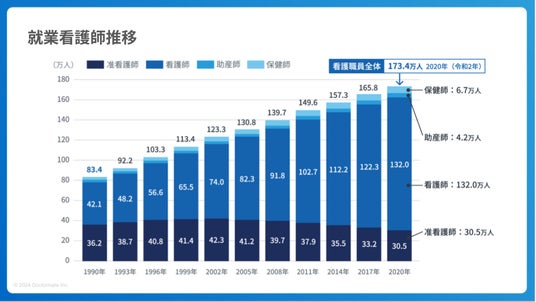 就業看護師は2020年は約173.4万人で、2011年149.6万人と比較すると約23.8万人近く増加してます(※2 図表参照)。しかし、2025年 約188万人の看護師が必要と推計され(※3)、過去12年間の年平均2,7万人の増加ペースでは、人材不足を解消するのは難しい状況です。