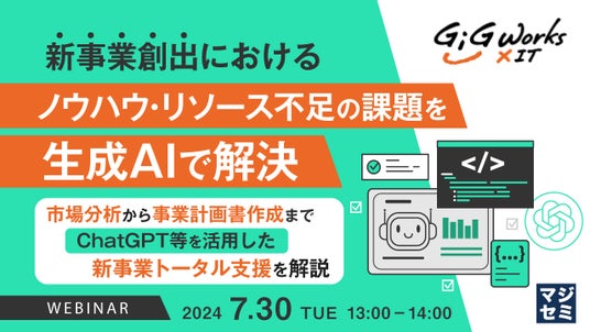 ギグワークスクロスアイティ株式会社(ギグワークス株式会社(東証スタンダード 2375)子会社 本社:東京都港区、代表取締役:小島正也、以下ギグワークスクロスアイティ)は、『新事業創出における課題を生成AIで解決』をテーマとしたオンラインセミナー開催し、ChatGPT等を活用した新事業トータル支援について解説します。