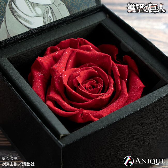 天然のダイヤモンドがきらめく最高級のプリザーブドローズを一輪一輪に加工し、ボックスに収めたリヴァイをイメージしたフラワーギフト。