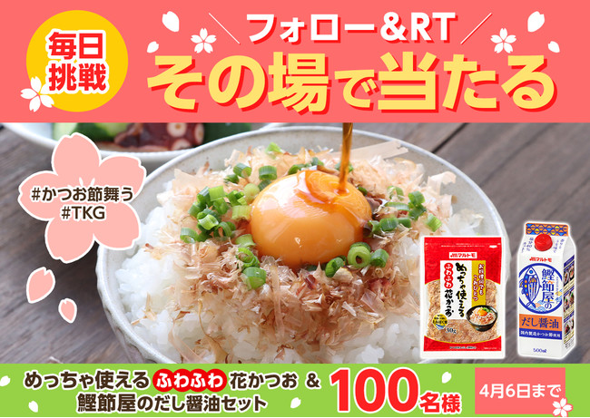 本キャンペーンはマルトモ公式Twitterのアカウントをフォローし、対象のツイートをリツイートすることでどなたでも、毎日、ご応募いただけます。ふんわりやわわかとろける食感の花かつおと、かつお節の燻香を効かせだしの香り豊かなだし醤油で、自分史上最高のたまごかけご飯をお楽しみください!