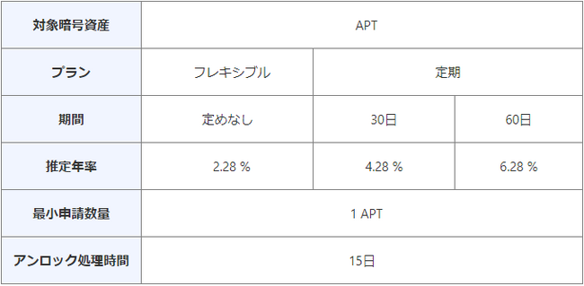 APTのステーキングサービスでは、ロック期間の制限がない「フレキシブル」プランと、30日・60日のロック期間がある「定期」プランをご用意しており、60日の定期プランでは、最大年率6.28%のステーキング報酬を得ることができます。