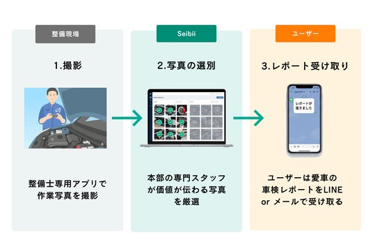 株式会社Seibii(本社:東京都港区、代表取締役CEO:千村 真希、以下 Seibii)は、提供する「セイビー出張車検」において、整備・点検内容をお客様のスマートフォンへ即座に報告する「車検レポート」機能を正式リリースいたしました。