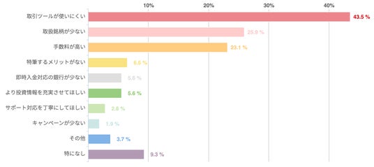 アンケートによれば、「取引ツールが使いにくい(43.5%)」点を不満に挙げた回答者が最も多かった。