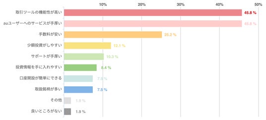 アンケートによれば、顧客が評価している主な点は、「取引ツールの機能性の高さ(45.8%)」と「auユーザーへのサービスの手厚さ(45.8%)」であった。