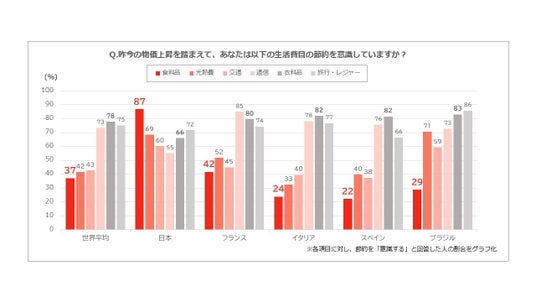 日本のビジネスパーソンの間で、節約意識が最も高まっている費目は「食料品」です。昨年から引き続き、今年も世界平均の2.4倍となる87%ものビジネスパーソンが食料品の節約を意識しており、世界で最も食料品の節約意識が高い国となりました。一方、他国に目を向けると、衣料品(78%)、旅行・レジャー(75%)といった“おしゃれ・娯楽”分野の節約意識が依然として高く、食料品(37%)、光熱費(42%)はさほど高くありません。加えて、日本・世界ともに食料品の物価上昇には落ち着きが見られることから、日本では特に「生活に直結する費目(食・光熱)から抑える」という傾向が改めて浮かび上がっています。