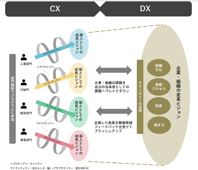 本プログラムでは、個人のキャリア変革(CX)とデジタルテクノロジーを活用した企業・組織の変革(DX)とを紐付け、組織の変革課題を自分自身の当事者としての課題へブレイクダウンします。自分自身の能力・スキル・キャリア開発が、組織の課題解決に直結するイメージを持つことで、地に足の着いた行動を促し、小さな成功体験を積み重ねることで、大きな課題に向き合うマインド、リーダーシップを養い、自分自身の軸を持ちながら変幻自在に生き抜く術を身に付けていきます。FLMのDX推進人材の育成プログラムに加えて、変革の起点となる個人のCXの基盤となる考え方に「現代版プロティアン・キャリア理論」を据え、DX推進部門のみならず、経営企画、人事、現場などの複数部門から選抜されたメンバー が各職場からのフィードバックを共有しながら共通言語を紡ぎ出し、自社のDXの方向性を打ち出して、実現までのステップを具体化していきます。その過程で、自身のキャリアについても、成長に必要な知識・スキル・経験を蓄積していきます。