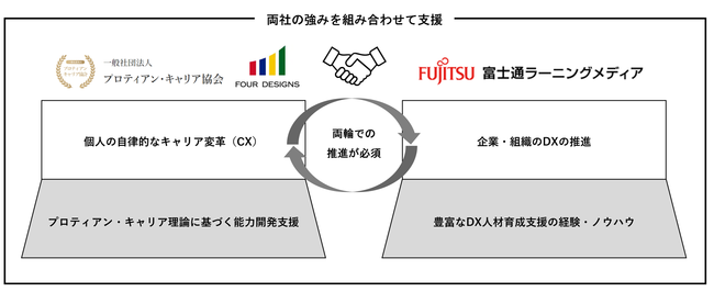 一般社団法人プロティアン・キャリア協会(所在地:東京都新宿区、代表理事:田中 研之輔、有山 徹、以下、「当協会」 )と総合人材育成企業 株式会社富士通ラーニングメディア(本社:東京都大田区、代表取締役社長:青山 昌裕、以下、「FLM」)そして4designs株式会社(本社:東京都渋谷区、代表取締役: 有山 徹、以下、「4designs」)は、個人のキャリア変革(キャリアトランスフォーメーション:CX)と、企業・組織のデジタルトランスフォーメーション(DX)の両輪で変革の推進を支援するため2022年6月28日(火曜日)に業務提携し、新たに共同開発した能力・組織開発プログラムの第一弾として「CX×DX実践プログラム(入門編)」の提供を開始します。それに先立ち、7月22日(金曜日)に説明会(https://dx-cx-protean.peatix.com)を開催しますので、あわせてお知らせいたします。