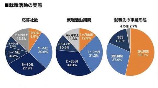 内定先の事業形態として、自社開発企業が53.1%、受託開発企業が27.9%となり、全体の8割以上(81.0%)が開発体制の整った環境でキャリアをスタートすることに成功しています。