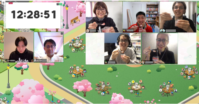 ランチの時間を有効活用して、より多くの方に仲間とのコミュニケーションを促進するオンライン交流を楽しんでいただきたいと考え、本挑戦を実施しました。挑戦当日はoViceやご賛同企業から166人がバーチャル空間上に集合。5~7人のテーブルに分かれ、満開の桜で埋め尽くされたバーチャル空間「oVice」上で、桜をモチーフにした3種類のケーキを試食しました。