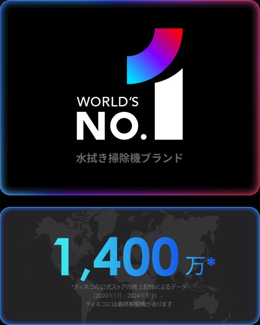 ※2 2022年7月2日~2024年6月29日時点、「Stackline」というコンサルティング会社の調査によれば、カナダ、日本、ドイツ、フランス、イタリア、イギリス、アメリカなどのAmazonにおいて、掃除機の中から「コードレス水拭き掃除機」のメーカー別販売数量と販売金額シェア率が調査されました。その結果、Tinecoはこのカテゴリにおいてシェア率No.1を獲得していることが示されています。