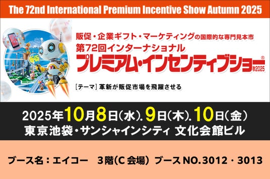 株式会社エイコー(本社:東京都墨田区)は、 2025年10月8日(水)~10月10日(金)に東京池袋・サンシャインシティ 文化会館ビル コンベンションセンターにて開催される、販促・企業ギフト・マーケティングの国際的な専門見本市「第72回インターナショナルプレミアム・インセンティブショー秋2025」(主催:株式会社ビジネスガイド社)に出展することをお知らせいたします。
