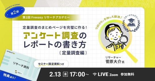 全国1,300万人の調査モニターへ500円からネットリサーチが行えるセルフ型アンケートツール“Freeasy(フリージー)”を展開するアイブリッジ株式会社(本社:大阪市福島区、代表取締役社長:荒川和也)は、『Freeasyリサーチアカデミー第2期 第2回【オンラインセミナー】 アンケート調査レポートの書き方(定量調査編)』を2025年2月13日(木)17時から開催いたします。