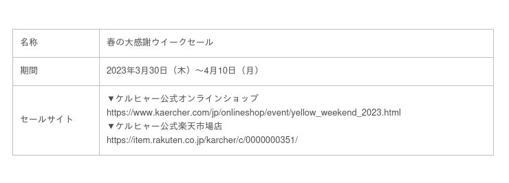 清掃機器の最大手メーカー、ドイツ・ケルヒャー社の日本法人、ケルヒャー ジャパン株式会社 (本社:神奈川県横浜市港北区、代表取締役社長:マーク・ヴァン・インゲルゲム)は、2023年3月30日(木)~4月10日(月)の12日間、春の新生活・お引越しに最適なケルヒャー製品を対象とした「春の大感謝ウイークセール」を開催します。