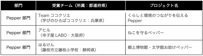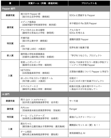 今年は、Pepper部門では掛川市立北中学校・掛川北中Pepper部のプロジェクト「SDGsに貢献するPepper」、AI部門では岩手県立盛岡商業高等学校・熊川山小(くまがわやまこ)のプロジェクト「サーモ君」がそれぞれ最優秀賞を受賞しました。