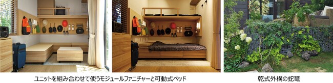 内装には戸建住宅の設備を採用し、細部までこだわった住宅デザインによって居心地の良い上質な空間を実現しています。また、収納空間として「蔵」を設けることで、リネン等をしまう事業者用の収納スペースになります。「蔵」上部の小上がりは2人用のベッドとして使用でき、ベンチ収納は寛ぎの場に。ワークスペースやシャワーブース、洗面・トイレも備えることができ、自然災害が発生した「もしも」のときは、応急仮設住宅として利用可能です。