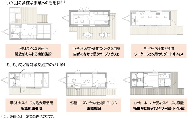 ミサワユニットモビリティ「ムーブコア」は、ミサワホーム独自の木質パネル接着工法をはじめ、戸建住宅と同等の構造により、断熱性や遮音性能など、住宅品質の優れた居住環境を備えるトレーラーハウスです。また、住宅メーカーの知見を生かした生活提案や、頻繁な用途の変更に対応する可変性・即応性に優れた乾式内装などの新発想により、「いつも」は宿泊施設やカフェ、ワーケーション施設など多様なニーズに応える施設として使用し、「もしも」の際は速やかに応急仮設住宅などに転用されることで良質な住まいとして被災後の暮らしを支えます。