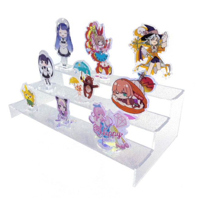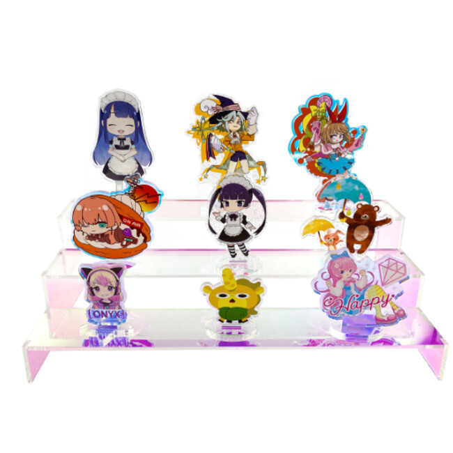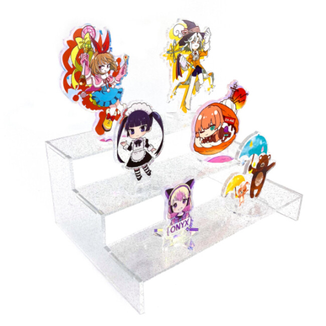 アクリルひな壇はアクスタやフィギュアの魅力を最大限に引き出すことができる商品です。マニキュアなどコスメ用品の展示も可能で、使い方次第でいろいろお楽しみ頂けます。