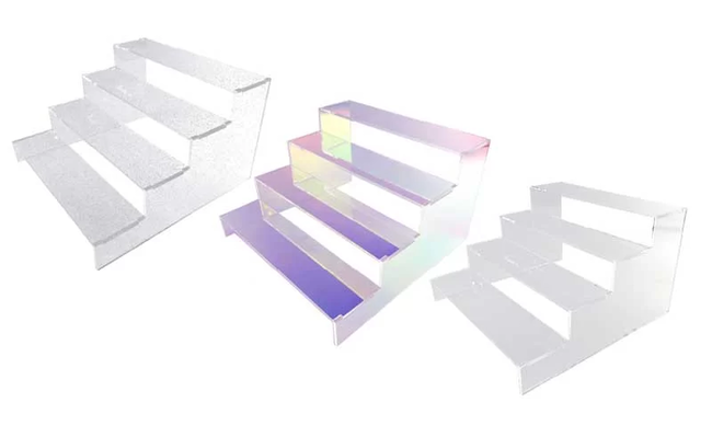 アクリルひな壇はクリア・オーロラ・ラメカラーをご用意。またサイズとお好みの段数をお選べるなど、お客様の用途にマッチしたアクリルひな壇をお届け頂けます。