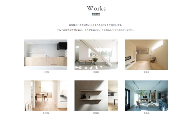 「家づくりから、暮らしづくりへ。」をコンセプトに、建築物としての主張を抑え、住む人の個性にフォーカスを当てております。壁の色を白に統一し、シンプルな間取りで、余計な装飾を施さない、その上で毎日眺める庭の植栽や肌に触れる家具のひとつひとつを丁寧に選んでいくことで、「Fの家」らしい空間をお客様と一緒に模索していきます。